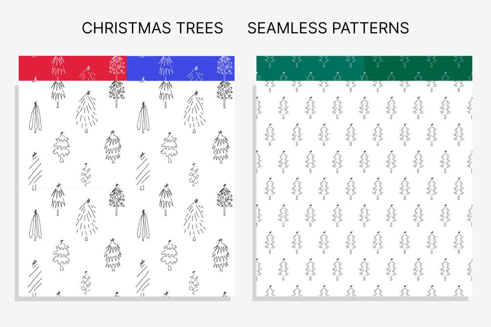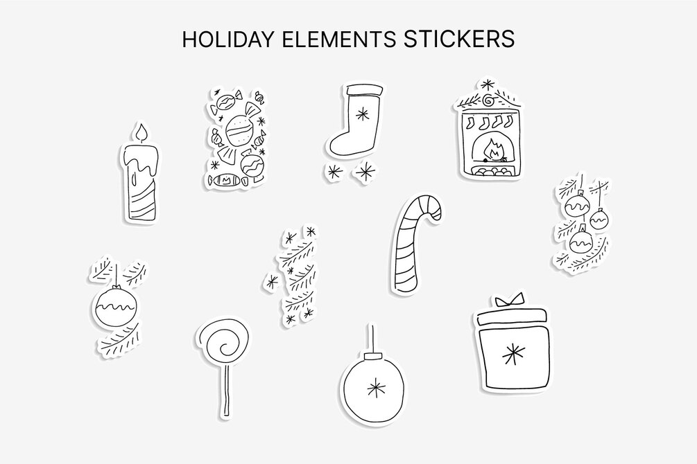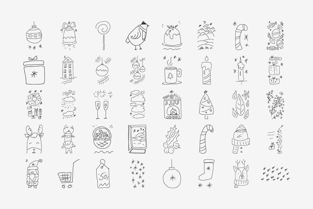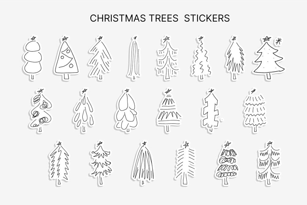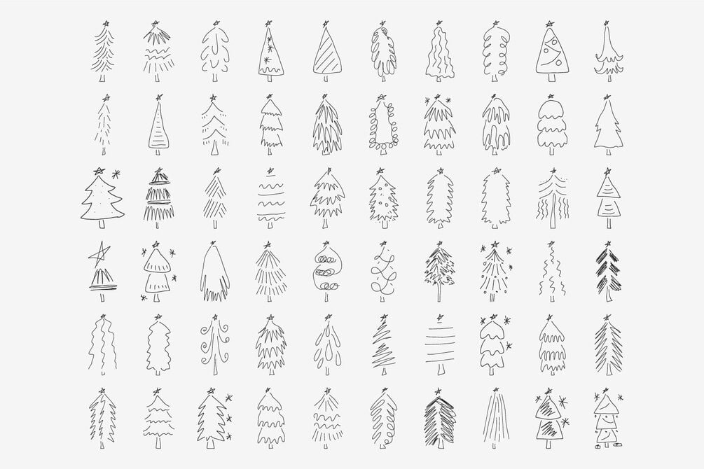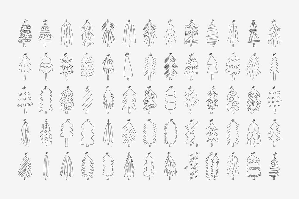 A hand-drawn collection of 165 Christmas doodles, featuring 125 hand-drawn Christmas trees variations and 40 holiday doodles, including ornaments, branches, snowflakes, stars, deer, wreath, candle, gift box, fireplace, candy cane, winter clouds and more.